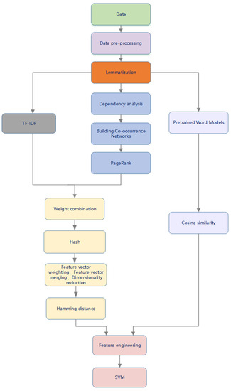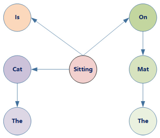 To more accurately quantify the importance of each word within a text, this study proposes a text hashing calculation method based on the PageRank algorithm. In this approach, we conceptualize the text as a network where each word represents a node and syntactic dependencies between words act as the edges connecting these nodes [27]. Syntactic dependencies delineate the relationships between words within sentences. For example, in the sentence “the cat is sitting on the mat”, the term “sitting” depends on “cat” to denote the actor of the action, whereas “mat” relies on “sitting” to denote the target of the action.