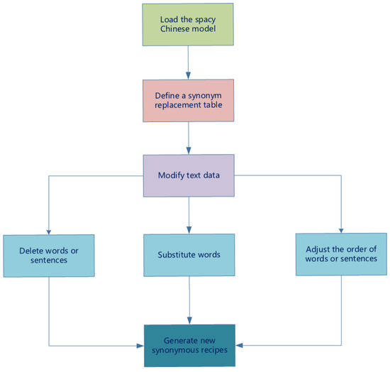 Because there is no authoritatively recognized Chinese dataset for the digital recipe text detection task, we crawled 600 related recipe data points from mainstream websites as experimental data. To evaluate whether the SimHash algorithm proposed in this paper improves the accuracy in a similar text detection task, we processed 300 of the original data as follows (as shown in the Figure 6):