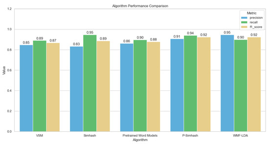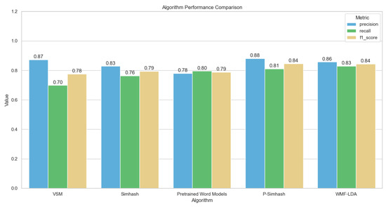 We selected 1400 pairs of preprocessed English text data from the STS dataset and 600 pairs from the Chinese recipe dataset, to which we applied the traditional SimHash algorithm, the pretrained word-model-based approach, VSM, WMF-LDA, and our improved P-SimHash algorithm. The specific process is shown in Figure 7. We recorded and counted the number of similar texts and the number of misclassified texts found by each algorithm. Comparison results on the STS dataset are shown in Table 2, which demonstrates the average performance of each algorithm in terms of accuracy.