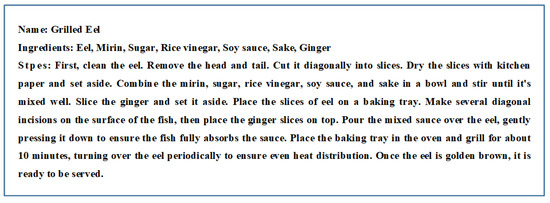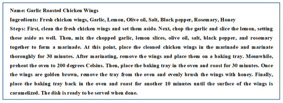 Degree of detail (D) measures the number of modifiers and verbs in the ingredients and steps of the recipe. Specifically, a recipe is considered more detailed if it contains a large number of modifiers for ingredients (such as “fresh” and “tender”) and specific quantities required for the ingredients (such as “grams”, “stalks”, and “spoons”), as well as a large number of verbs in the steps (such as “cut”, “sauté”, and “stir-fry”). The specific calculation formula is: ((number of ingredient modifiers + number of step verbs)/(number of types of ingredients + number of types of step verbs)) ∗ 100.