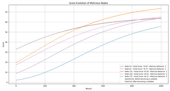 In this experiment, we initially set up 50 validator nodes for the first round. We randomly selected 25 nodes as malicious nodes, assigned different malicious behaviors, and conducted 1000 rounds of the consensus process. The main focus during this process was whether our penalty mechanism could effectively punish the malicious nodes and reduce their scores. As time progressed, as long as nodes actively participated in the network and consensus process, the penalty for malicious nodes could be mitigated through a time decay factor. We randomly selected the consensus processes of five nodes for evaluation. The experimental results are presented in Figure 13: