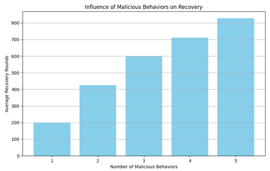 In this experiment, we focus on evaluating the time required for nodes with different numbers of malicious behaviors to eliminate their malicious impact; we calculate the average number of rounds required for nodes with different numbers of malicious behaviors to revert back to being a verified node for the first time after they actively participate in the network maintenance and do not produce any more malicious behaviors, since the impact of malicious behaviors on the blockchain network is crucial. Therefore, we have to ensure that the negative impact can be eliminated only after a certain period of time. In addition, we need to focus on the average number of rounds required for nodes with different numbers of malicious behaviors to eliminate the malicious impact, and the punishment for nodes with multiple malicious behaviors should be more severe. The experimental results are shown in Figure 14.