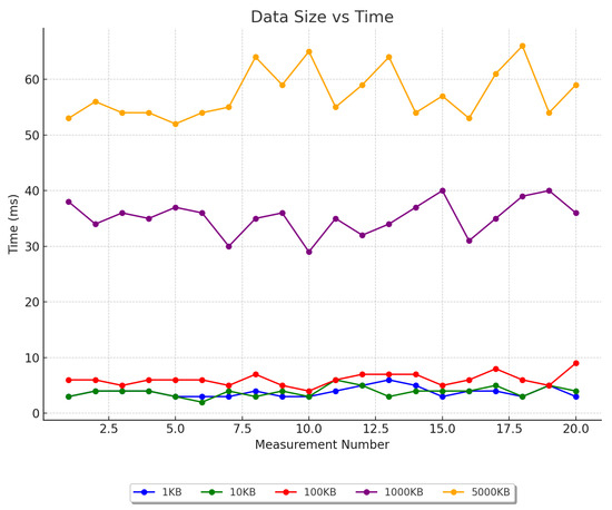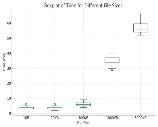 According to the experimental results, the basic time consumption of 1100 KB files is about 0–10 ms, the average time consumption of approximately 1000 KB files is 35.25 ms, and the average time consumption approximately 5000 KB files is 57.4 ms, as shown in Figure 15 and Figure 16. Experiments show that the model achieves good results in terms of data storage and upload. However, in chain operations, the results show that as the data size increases, the chain operation time also increases, mainly due to the validation process required to process transactions on the Ethereum network; the time consumption of this process increases as the data size increases. In general, the experimental results prove the effectiveness of the design scheme proposed in this paper. The scheme can smoothly process data of different sizes and types and meet users’ normal needs in the current blockchain environment without affecting the normal network performance of the system.