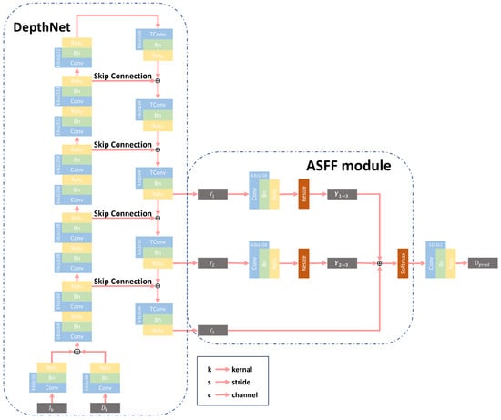 Inspired by [30], the core idea of the method in this paper is to propose an end-to-end architecture with adaptive spatial feature fusion by encoder–decoder (ASFF-ED) module, and this architecture is able to achieve adaptive adjustment during feature extraction by optimizing pixel-level weights. Specifically, when extracting features on feature maps of different scales, the adaptive feature fusion module is able to extract detailed information of small objects on large-scale feature maps, while extracting the overall features on large scales on small-scale feature maps. This strategy effectively alleviates the problem of depth information loss in the downsampling process, thus improving the performance of the depth completion.