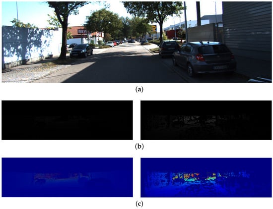Currently, LiDAR is a widely used hardware device among the depth information collection methods. LiDAR calculates the distance of an object by emitting a laser beam and measuring its return time. Compared with other sensors, LiDAR has high precision and can provide reliable depth information. However, LiDAR has some limitations, the most prominent of which is the sparsity of the data due to the sampling nature of this method. The point cloud of the LiDAR, which emits 64 beams, are projected into the camera’s coordinate system, and the depth information accounts for about 5% of the total pixels [2]. In practical applications, the point cloud data collected using LiDAR are usually very limited and do not provide a complete pixel-level depth map.