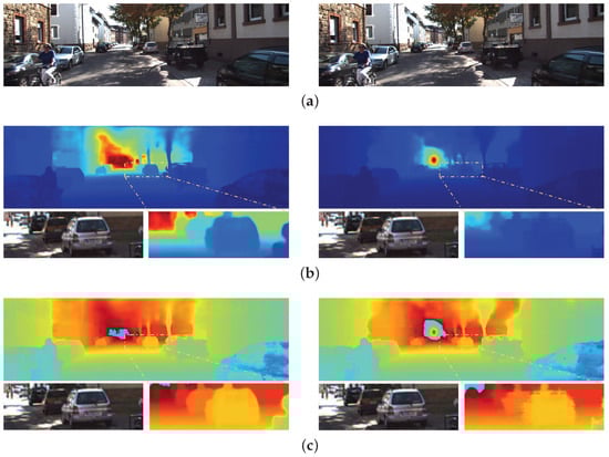 - Godard, C.; Mac Aodha, O.; Brostow, G.J. Unsupervised monocular depth estimation with left-right consistency. In Proceedings of the IEEE Conference on Computer Vision and Pattern Recognition, Honolulu, HI, USA, 21–26 July 2017; pp. 270–279. [Google Scholar]