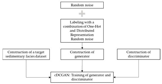 As important prior knowledge, the training image library can be used to build the reservoir facies based on the training image. In this part, we analyze the thought and defect of the traditional training image library building approach, which is based on the traditional training image library. Then, we construct a training image library based on a conditional deep convolutional generation adversarial network (cDCGAN). This is the workflow for this section to clearly delineate the different steps and processes involved in constructing the training image library (Figure 1).