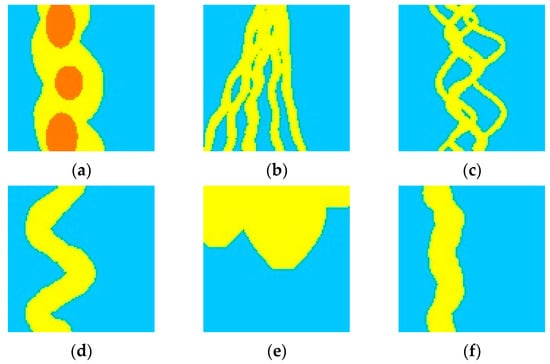 In actual applications, it is necessary to select the type of training image in accordance with the expert’s knowledge of the regional geology. The selection of training images should be broadly representative of the type and distribution of regional sedimentary facies in order to provide a better understanding of the geology of the deep learning model. The training image set should include as many typical sedimentary systems as possible, and it can be easily constructed in batches. The training image results obtained from the target-based simulation method in PETREL® are used as the data for method testing, and a total of 60,000 braided river facies, straight river facies, meandering river facies, anastomosing river facies, braided river delta facies, and fan delta facies with a size of 100 × 100 were selected as the training images (Figure 2).