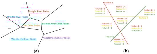 In order to compare the different types of representations, the Curve River’s source direction and channel width are taken as an example to further explain One-Hot and Distributed Representation. As shown in Figure 4, the feature dimensions of One-Hot Representation will be increased. In the drawing, the four characteristics are: northwest target source wide channel, northwest target source narrow channel, northeast target source wide channel, and northeast target source narrow channel. Black circles indicate the activation state of a feature. This representation makes a good distinction between the categories, but it does not provide any information about the relationship between the training images.