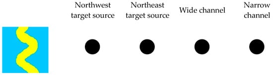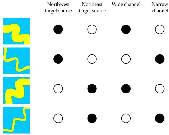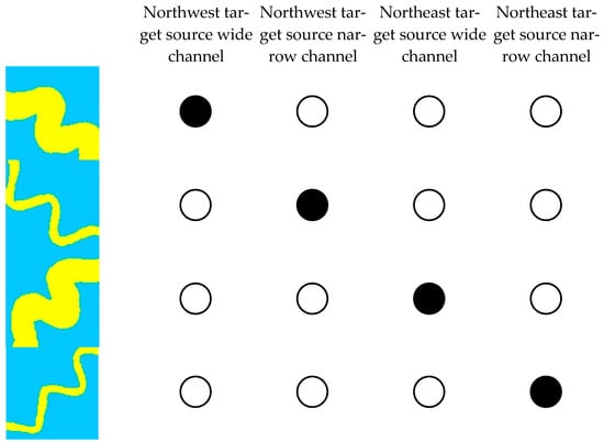 Figure 5 illustrates the Distributed Representation of the same training image. This approach is used to represent the information of the training image in relation to the concept of the source orientation and the channel width. The characteristic parameters include the northwest source, the northeast target source, the broad channel, and the narrow channel. The black circle indicates the activation status of a feature, and the characteristic parameters include the information of the training image and the relationship between different training images.