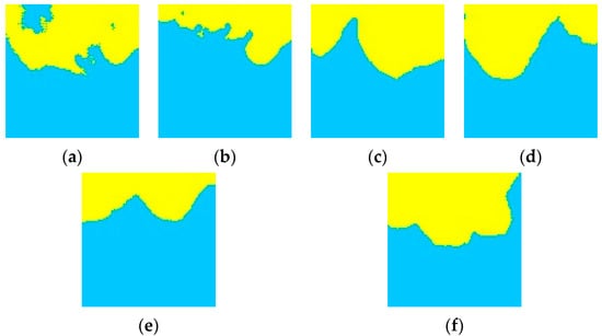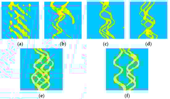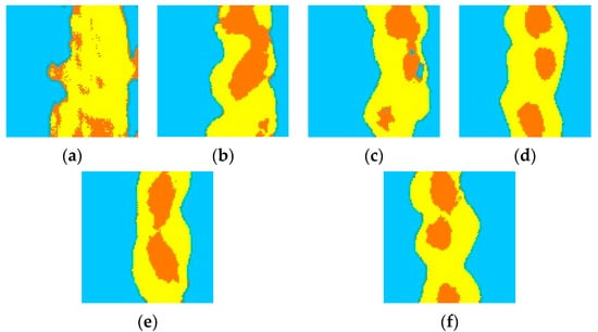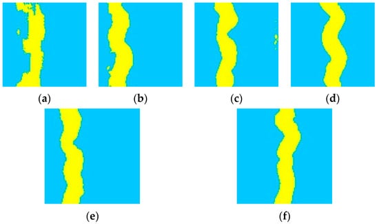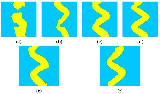 Generation results of meandering river facies training images: (a) 200 steps; (b) 1200 steps; (c) 2200 steps; (d) 3200 steps; (e) generation result 1; (f) generation result 2 (yellow represents a river region, blue represents background).