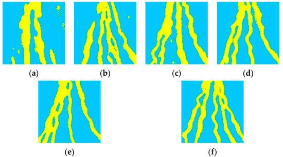 Generation results of anastomosing river facies training images: (a) 200 steps; (b) 2200 steps; (c) 4200 steps; (d) 6200 steps; (e) generation result 1; (f) generation result 2 (yellow represents a river region, blue represents background).