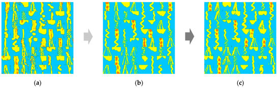 Generation results of training images of multiple typical sedimentary facies: (a) 200 steps; (b) 3200 steps; (c) 5600 steps (yellow represents a river region, blue represents background).