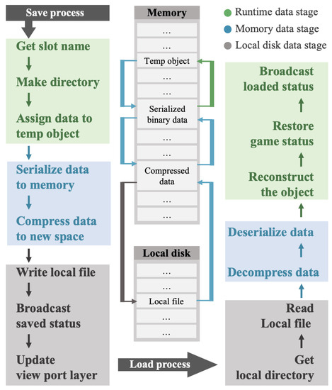 Depending on the form of data existence, saving and loading is divided into three stages: obtaining or loading saved data, serializing or deserializing saved data and saving or loading archive files. These stages are described in detail below.