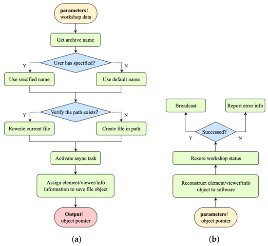 As shown in Figure 4a, after a workshop administrator gives a saving command, the system begins by obtaining the archive name specified by the administrator; if the archive name is not specified, the default name is used. If the archive file already exists, subsequent saving operations will overwrite the existing data in the file. Once the archive file has been created, the multi-threaded task begins. Using multi-threaded asynchronous operations, it can speed up processing and avoid thread blocking, thus improving the performance. Three objects are created to temporarily store saved information. The element object is used to temporarily store information related to the equipment, such as the equipment name, location information, subassembly information, etc. The viewer object is used to temporarily store data, such as viewer position and rotation information, and the info object is used to temporarily store information such as the file name, timestamp, username, etc. Assigning data to the above three kinds of staging objects can help to classify the scattered data into groups and facilitate the serialization of object data into the memory.