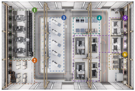 DTWorks was used to create a virtual workshop scene with which to evaluate the functionality of the saving and loading module. Figure 9 depicts the constructed discrete manufacturing workshop plan, which includes a pallet exchange flexible manufacturing system marked as (1), a (semi-)finished product storage area marked as (2), five CNC machining centers marked as (3), a blank storage area marked as (4), six gantry machines marked as (5) and three AGV logistics carts and their charging stations marked as (6).