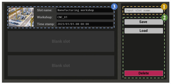 Modules used to save and load workshop scenes are incorporated into DTWoks. As depicted in Figure 10, the saving and loading user interface is called out in Runtime mode. The archive name window (marked as 1) is used to name the workshop scenes to be saved; the archive operation panel (marked as 2) is used to save, load and delete the workshop scenes; and finally, the archive list (marked as 3) displays the saved archives, along with the workshop scene thumbnail, archive name, workshop name and the timestamp.