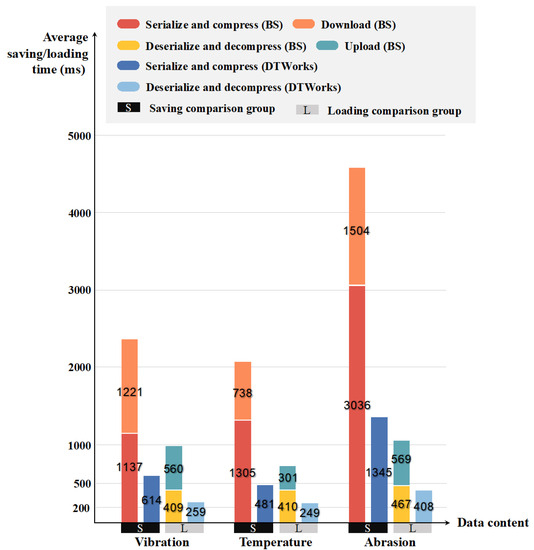 The procedure for testing data saving and loading efficacy using a B/S-based DT platform is very similar to that of DTWorks, with the following exceptions: due to the B/S architecture’s features, the saved archive is downloaded after the data have been saved on the server side and uploaded before the data are reloaded on the server side; the time spent on these two operations is also recorded. The B/S architecture’s saving and loading functions are implemented in Python and endowed with a 200 Mbps broadband connection. Due to the uniqueness of the test dataset, it is important to note that the data content does not change during repeated testing of the saving and loading efficiency of typical composite data using both platform architectures.