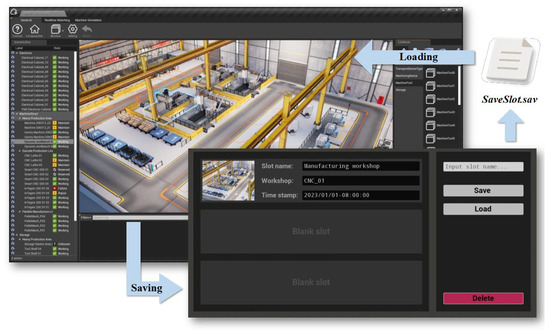 As depicted in Figure 13, the example workshop scenes were saved locally to the computer according to the saving and loading system proposed in this paper, and the sav archive file was successfully created; the archive file was successfully reloaded to the DTWorks workshop software system by this system, and the historical scene state of the workshop was successfully restored.