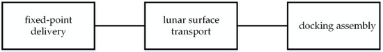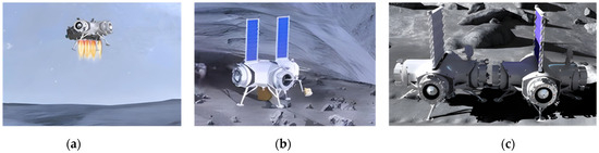 The LSB construction is divided into three main processes, as shown in Figure 1: (a) the fixed-point delivery of equipment on the lunar surface; (b) the lunar surface transport of equipment; (c) the docking and assembly of equipment on the lunar surface. Firstly, the lander transports the equipment required for the LSB operation from the earth orbit to the lunar orbit and further delivers it from the lunar orbit to the lunar surface landing site, thereby achieving a safe and stable landing on the lunar surface. Secondly, the lander converts from a landing attitude to a walking attitude or releases the lunar rover to complete the reliable and smooth transport of equipment from the landing site to the LSB destination. Afterward, the necessary docking and assembly of the equipment are performed at the LSB destination to form a functional module assembly [7]. The LSB construction is a long-term and gradual process that needs to be completed in stages according to the mission plan. Generally, the LSB construction process consists of times of fixed-point delivery, times of lunar surface transport, and times of docking assembly.
