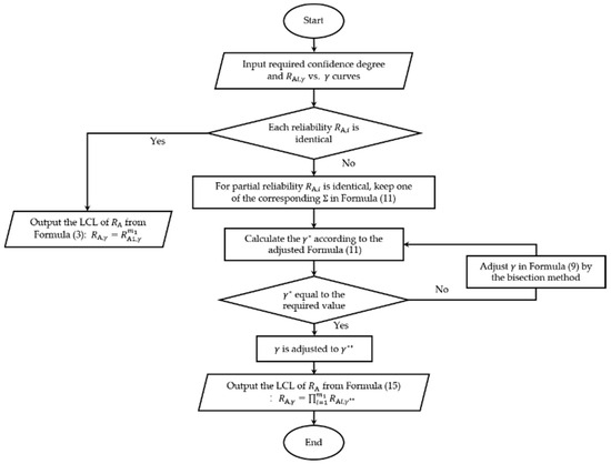In order to obtain the exact LCL for overall constructed reliability, it is necessary to adjust the confidence degree of in Formula (17) to , until calculated by Algorithm 2 is equal to the required value of . In other words, find the value of such that the confidence degree for in Formula (17) satisfies . Finally, the LCL of the overall construction reliability with the confidence degree is provided by