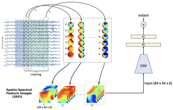Prediction pipeline consisting of an SSFI processing stage followed by a CNN model. Small windows , , …, are extracted from a 14-channel EEG, transformed into SSFI, and then fed into the CNN model.