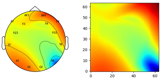 Given a multi-channel EEG segment and a set of frequency bands of interest, an SSFI array is generated as follows. Rectangular grids are used to represent the spatial density of power within one frequency band and are constructed using spherical-to-polar coordinate conversion, so that the scalp locations corresponding to the recording electrodes are associated to one of the grid locations. Based on the power spectral density of each EEG channel, the power in each frequency band is computed and assigned to the electrode’s entry in the corresponding rectangular grid. The spatial density of power on the grid is then obtained by interpolating and extrapolating the values computed from each electrode, by using a bicubic method adapted from the MNE library [37]. Figure 2 shows the spatial density of power for a single frequency band on a scalp topography and its corresponding rectangular grid. By stacking the spatial densities of power, we obtain the final SSFI array of dimensions .
