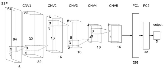 A CNN architecture (Figure 3), consisting of five convolutional layers (CNV), two fully connected layers (FC), and one output layer with three output units, was used to solve the proposed ternary classification problem. The number of input channels in this architecture is six, which corresponds to the number of frequency bands in the input SSFI arrays. Each convolutional layer consists of a bank of filters of size . The first four convolutional layers are followed by a max-pool layer, batch normalization, and dropout () layer. As shown in Figure 3, the first layer (CNV1) has 32 filters and the remaining CNV layers have 16. The activation function used for the output layer is softmax, whereas for the hidden layers, it is a rectified linear unit (ReLu) with regularization parameter. Dropout and L2 regularization are used to reduce the risk of over-fitting.