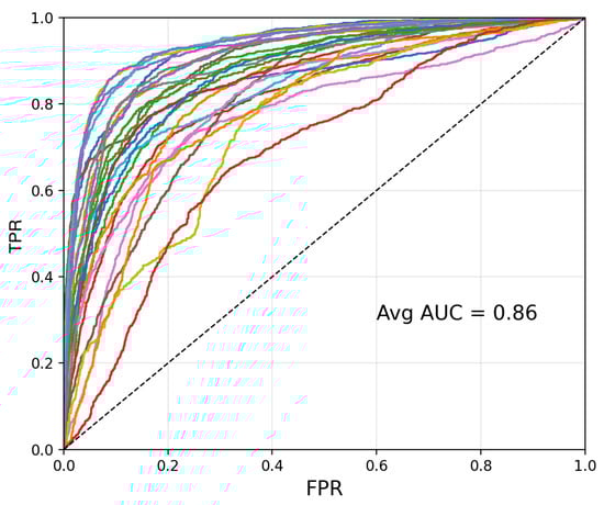 ROC curve of all the 25 CNN models relating true positive rate (TPR) and false positive rate (FPR) values.