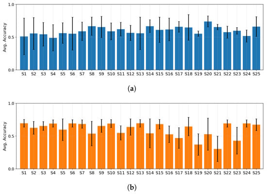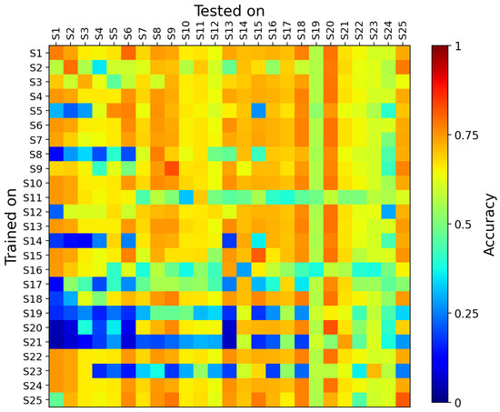 The results of the ISD analysis are shown in Figure 6 and Figure 7. Figure 6 shows a matrix representing the performance of the CNN models trained on each subject and tested on all 25 subjects. It is interesting to note that this matrix is not symmetric. Symmetry would have suggested that the performance of a model trained on subject A and tested on subject B is similar to the performance of a model trained on subject B and tested on subject A. It can be observed that compared to other models, the CNN model trained on subject S1 performs well on the other subjects. In contrast, the CNN model trained on subject S19 and S21 performs poorly on the other subjects. The results from Figure 6 can be summarized in two other plots, namely the average performance of all the trained models when tested on data from one single subject, as shown in Figure 7a, and the average performance of each model when tested on data from other subjects, as shown in Figure 7b. Figure 7b highlights that the model trained on S1 performs well on data from the other subjects, with a very low variability in performance. In contrast, Figure 7a indicates that the average performance of the models trained on every subject but S1 is low, with high variability when tested on data from S1. The performance of all the models tested on S19 and S21 is consistently higher than 0.5.