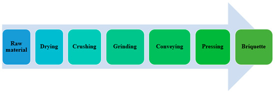 The densification of biomass involves the compression of the biomass into briquettes that are up to ten times denser than the original biomass material. Biomass bulk and energy density per unit volume increase as a result of this type of processing. A reduction in storage requirements, an improvement in transportation efficiency and a reduction in particulate emissions per unit volume of material can be achieved in this manner. In addition, it provides uniform feed to industrial and domestic equipment, such as rural stoves, gasifiers, and boilers. In general, fuel briquettes have superior energy properties than raw materials, including higher density, higher calorific value (particularly per unit of volume), and lower moisture content [7,8].