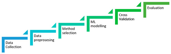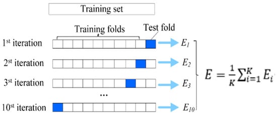 Cross-validation is a useful technique for choosing the best model when there are little available data. Cross-validation offers a more reliable estimate of the model’s performance on unknown data, which helps prevent overfitting. Cross-validation is a more data-efficient method than conventional validation procedures since it enables the use of all the available data for both training and validation. The most common of the cross-validation methods is the K-Fold cross-validation method. In the K-Fold cross-validation method used in the study, the data are randomly grouped and divided into “k” subsets. One of them is used for testing and the remaining “k − 1” is used for training. This process is repeated “k” times. The average of the results determines the accuracy of the method [41]. The K-Fold cross-validation diagram is shown in Figure 6.