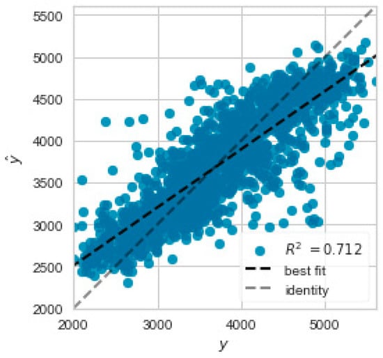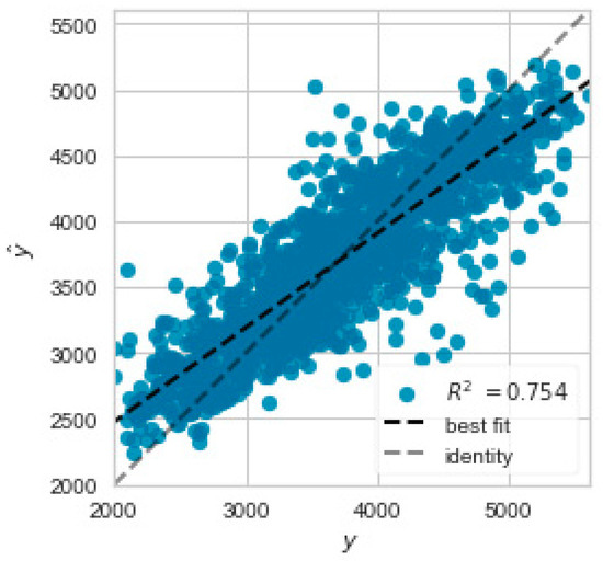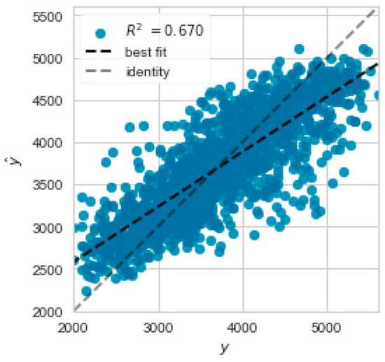 In a machine learning study, the model’s performance is enhanced through optimization of the parameters according to the dataset. Four commonly used statistical methods were used to evaluate the prediction accuracy of the models. These methods are the coefficient of determination (R2), root mean square error (RMSE), mean absolute error (MAE), and mean absolute percentage error (MAPE), defined as Equations (2)–(5) [43]. R2 indicates how well the independent variable x explains the dependent variable y in a regression model. The fact that the R2 value tends toward 1 when the variables are correlated linearly shows that the independent factors account for the majority of the variation in the dependent variable. RMSE is a quadratic metric used to quantify the error magnitude of a machine learning model. It is usually employed to evaluate the discrepancy between the predicted and actual values, i.e., the distance between them. RMSE is calculated as the square root of the average of squared prediction errors, representing the standard deviation of the prediction errors. MAE measures the differences in errors between matched observations that express the same phenomenon. Examples of Y against X include contrasts between predicted and observed data, subsequent time and starting time, and one measuring technique and another measurement technique. MAPE is often used as a loss function in regression problems and model evaluation because of its very intuitive interpretation of relative error.