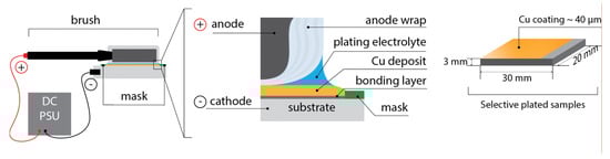 All utilized chemical reagents, purchased from Marvin Ltd. (Varna, Bulgaria), were of analytical grade quality, ensuring their reliability and accuracy. Two distinct plating electrolytes were used for copper deposition: an acidic solution with a pH value of 0.5 ± 0.1, and an alkaline solution with a pH value of 8.5 ± 0.1. It is worth noting that all experimental procedures were meticulously carried out under conditions of a controlled laboratory environment. The solutions were maintained at a constant temperature of 20 °C ± 1 °C throughout the selective plating process. The setup configuration for selective plating is illustrated schematically in Figure 1.