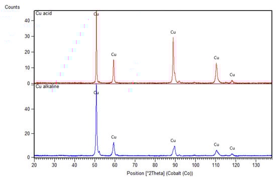 X-ray diffraction patterns of the selective copper coatings using either acidic (red) or alkaline (blue) electrolyte solutions.