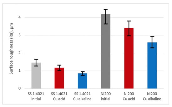 Surface roughness Ra of the as-received medical-grade stainless steel (SS 1.4021) and nickel alloy (Ni200) substrates (initial), and of the selective plated copper coatings deposited on them using either Cu acid or Cu alkaline electrolyte solutions.