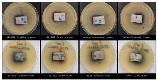 Antibacterial activity of selective plated copper coatings using either acidic (Cu acid) or alkaline (Cu alkaline) electrolyte solutions on medical-grade stainless steel (SS 1.4021) and nickel alloy (Ni200) samples against S. aureus (top row) and E. coli (bottom row) after 24 h incubation at 37 °C.