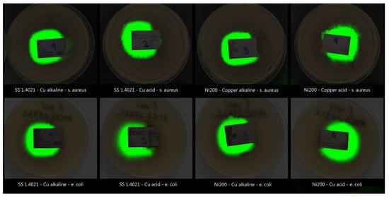 Highlighted extents of the inhibition zones (green) surround the selective plated samples using either acidic (Cu acid) or alkaline (Cu alkaline) electrolyte solutions on medical-grade stainless steel (SS 1.4021) and nickel alloy (Ni200) samples against S. aureus (top row) and E. coli (bottom row) after 24 h incubation at 37 °C.