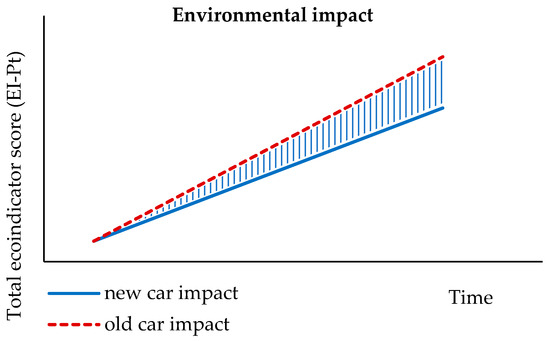 Optimization of car service lifetime which minimizes the environmental impact needs a balance between the benefits of introducing a new car and its production environmental costs. At time tB, the cumulative benefits from using a new car plus the environmental credit at tA balance the burden of the manufacturing of a new car. The optimization to minimize the cumulative environmental impact of both cars requires a longer payback period for the new car. With this hypothetical example shown in Figure 2, the minimum lifetime of a new car is tN–tA.