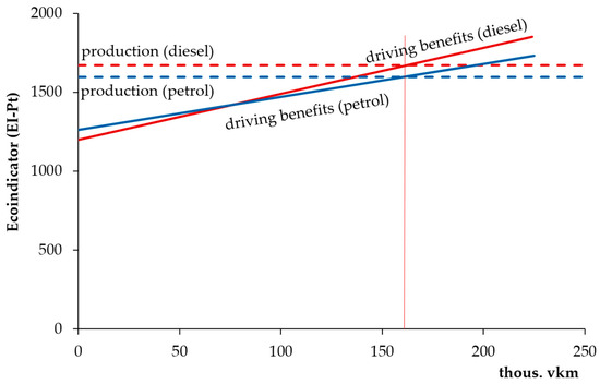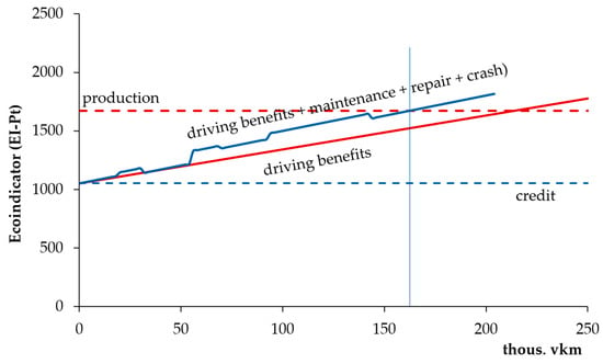 In Figure 4, the solid line shows the cumulative benefits of the increased efficiency of a new vehicle as a function of the number of kilometers driven. According to the optimization scheme (Figure 3), the introduction of a new vehicle with a mileage of 0 km gives an environmental advantage compared to the old car in use. The accumulation of benefits over a period not longer than the car usage limit should balance outlays on the production of a new car, which is represented by the horizontal dashed line.