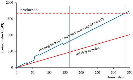 The y-axis presents the cumulated environmental impact, e.g., a total ecoindicator score (EI-Pt). The x-axis represents service lifetime or the vehicle kilometers traveled (vkm).