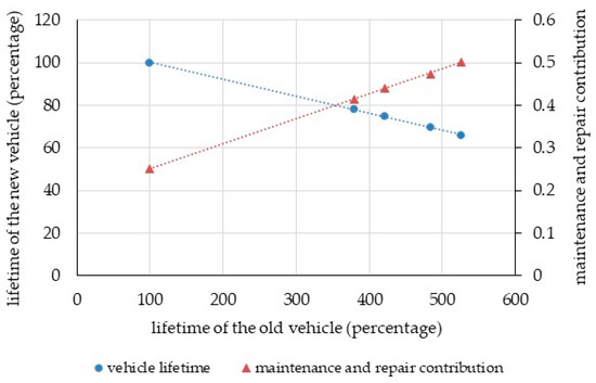A limited number of studies have considered the impact of maintenance on vehicle lifespan. Usually, LCA studies compare repair and replacement options for different components [32]. Kim et al. [33,34] presented a pioneering study, based on LCA methodology, about the environmental effects of replacing a vehicle with a more efficient model. The model was used to optimize car replacement time in a given planning horizon. Dynamic software was used to determine the dynamic environmental parameters of operation costs for each year of the given planning period. The authors took into consideration one-year environmental profiles for five phases of the product life cycle: production of materials, manufacturing, use, maintenance and pull-out from operation. While making a decision to replace based on calculated parameters, the authors also took into consideration technical improvements in successive versions of a model, including a share of recycled materials, material consumption, energy consumption, fuel efficiency, emission coefficients and component reliability for a generic 1995 mid-sized car used in the US. The cost of car maintenance represents the reliability of components. The introduced model made it possible to determine optimal replacement schedules on the condition that only one car is always replaced by another one and that the annual mileage is constant. The results of these studies indicate long optimal replacement intervals.