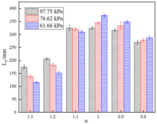 Variations of flame length with pressures and α (The pressure within the furnace varied from 97.75 to 61.66 kPa, and α varied from 0.8 to 1.3).