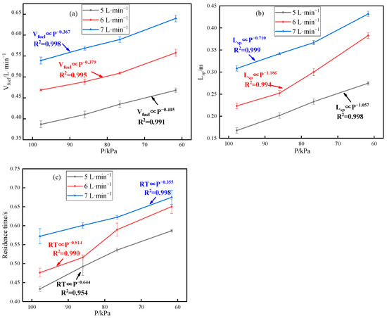 The fuel flow rate, flame length and residence time of smoke point under different pressures are compared, as the results show in Figure 6. As the pressure decreases from 97.75 to 60 kPa, more air is drawn into the flame region, leading to an increase in the α of the flame region under lower pressure. Hence, when the flame begins to emit smoke, the fuel flow rate of the smoke point also increases with decreasing pressure. As aforementioned, the flame length decreases with decreasing pressure under fuel-lean combustion, as the results show in Figure 4. However, it is observed that the smoke point flame length increases with decreasing pressure in Figure 6b. The soot formation increases with increasing pressure, which will reduce the smoke point flame length at a higher pressure. In a word, the increase of the smoke point flame length with decreasing pressure may be attributed to the decrease in oxygen mass per unit volume of air. In our work, the residence time is calculated here by dividing the flame height at the smoke point by the volumetric fuel flow rate [16], as shown in Figure 6c. Similarly, the residence time at the smoke point increases with decreasing pressure under sub-atmospheric pressure conditions. But other researchers observed the opposite conclusion at elevated pressures. This indicates that under sub-atmospheric pressure, the pressure-sensitive reaction pathways, which are governing the overall balance between smoke production and oxidation, are different with elevated pressure. In Figure 6, it is observed that the smoke point flame height, fuel flow rate, and residence time are found to vary with pressure to power laws, which is similar to the change patterns of ethylene, n-heptane and wood flames obtained by other researchers in an open environment [19,28]. Meanwhile, the fuel flow rates, flame lengths and residence time of the smoke point can be increased by increasing air velocity, and the effect still exists under sub-atmospheric pressures. Additionally, experimental results also show that the effect of air to the fuel velocity ratio on the smoke point is important. Further tests of the smoke point at different pressures and nozzle structures need to be conducted in the future.