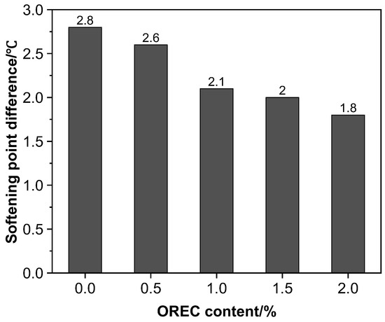 - Adding OREC improves the storage stability of WEO-modified asphalt. Compared to WEO-modified asphalt, the 48-h softening point difference of the composite-modified asphalt with 2% OREC content decreased from 2.8 °C to 1.8 °C, meeting the requirements of “Technical Specifications for Highway Asphalt Pavement Construction” for polymer-modified asphalt storage stability (≤2.5 °C).