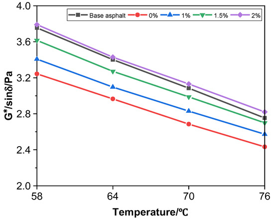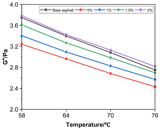 Figure 3 displays the test results of the complex modulus (G*) for base asphalt and OREC + WEO composite-modified asphalt at different OREC content levels. From the graph, it can be observed that as the temperature increases in the high-temperature range from 58 °C to 76 °C, the G* values of all asphalt samples gradually decrease, indicating that heating reduces the stiffness of the asphalt. At the same temperature, the WEO-modified asphalt without OREC consistently exhibits lower G* values than the base asphalt, suggesting that WEO softens the asphalt, leading to lower stiffness of WEO-modified asphalt compared to the corresponding base asphalt at high temperatures. With an increase in OREC content, the G* values of OREC + WEO composite-modified asphalt gradually increase, indicating that the introduction of OREC enhances the stiffness of WEO-modified asphalt. This is related to the fact that OREC itself possesses relatively high stiffness as a nanoclay and also hinders the movement of various components in the asphalt system. However, compared to the base asphalt, the modified asphalt with OREC content not exceeding 1.5% consistently exhibits lower G* values at high temperatures, thus showing lower high-temperature stiffness. When OREC content reaches 2%, the corresponding composite-modified asphalt demonstrates higher stiffness than the base asphalt. These results indicate that OREC, when added in an amount exceeding 1.5%, can fully compensate for the loss of high-temperature stiffness in WEO-modified asphalt compared to the base asphalt.
