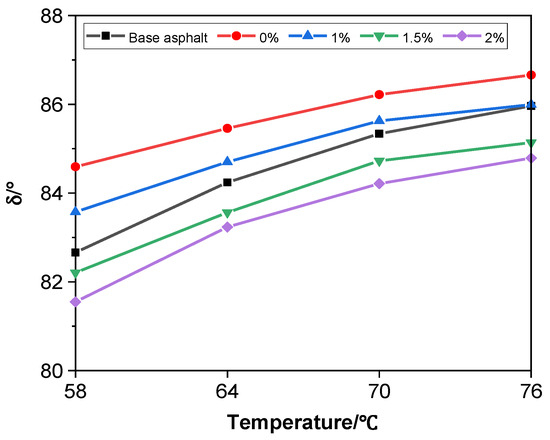 Figure 4 shows the test results of the phase angle (δ) for base asphalt and OREC + WEO composite-modified asphalt at different OREC content levels. From the graph, it can be observed that during the temperature increase, the δ values of the asphalt samples all show an upward trend, indicating that temperature rise promotes the transition of asphalt from elasticity to viscosity. Compared to the base asphalt, WEO-modified asphalt exhibits higher δ values in the temperature range of 58 °C to 76 °C, indicating lower elasticity and higher viscosity at high temperatures. WEO contains a considerable amount of aromatic components, which increases the content of light components in the asphalt [8,15]. The increase in light component content contributes to the asphalt exhibiting lower viscosity properties. Furthermore, from the graph, it can be seen that with an increase in OREC content, the δ values of OREC + WEO composite-modified asphalt gradually decrease, indicating that the addition of OREC helps reduce the viscosity of WEO-modified asphalt. For OREC content at 1% in the composite-modified asphalt, its δ value is still higher than that of the base asphalt. However, when the OREC content exceeds 1%, the δ value of the composite-modified asphalt decreases below that of the base asphalt. This implies that adding 1.5% or more of OREC is necessary to restore the elasticity of WEO-modified asphalt to a level above that of the base asphalt.