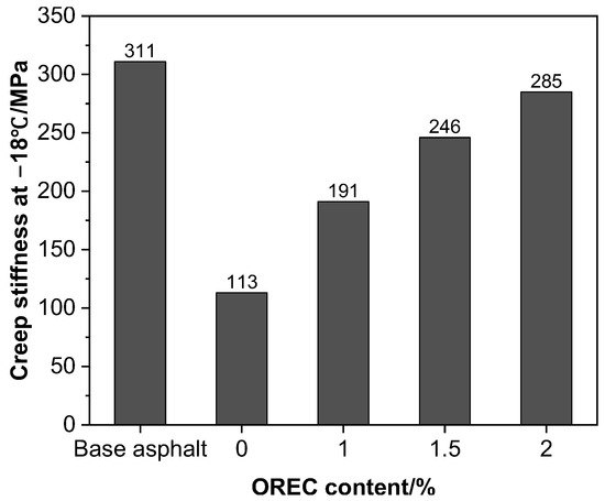 Figure 6 shows the test results of the creep stiffness (S) for base asphalt and OREC + WEO composite-modified asphalt at different OREC content levels. From the graph, it can be observed that the base asphalt has the highest S value at −18 °C. In comparison, WEO-modified asphalt exhibits a 63.7% reduction in S value, indicating that the addition of WEO significantly reduces the stiffness of the base asphalt at low temperatures, enhancing its low-temperature flexibility, and thereby improving the low-temperature cracking resistance performance of the base asphalt. This is attributed to the increase in the proportion of light components in the asphalt due to the presence of WEO. As the OREC content increases from 0% to 2%, the S value of OREC + WEO composite-modified asphalt gradually increases, indicating that the introduction of OREC increases the low-temperature stiffness of WEO-modified asphalt, thus reducing its low-temperature cracking resistance performance. When the OREC content reaches 2%, the corresponding composite-modified asphalt has an S value of 285 MPa, which is only 8.4% lower than the base asphalt. This means that the composite-modified asphalt with 2% OREC content does not show a significant difference in low-temperature cracking resistance performance compared to the base asphalt. Based on the increasing trend of S values in the graph, it can be inferred that as the OREC content continues to increase, the low-temperature stiffness of the corresponding composite-modified asphalt may exceed that of the base asphalt.