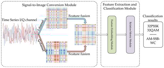 In the second part, a meta-learning-based relation network is designed for the classification of unknown signals. In practical applications, there are usually only a limited number of samples available for training. Therefore, conventional deep learning methods that rely on large-sample training struggle to adapt to small-sample conditions. To overcome this problem, we introduce meta-learning. Meta-learning leverages shared knowledge and patterns learned from different tasks, enabling fast adaptation to new tasks even with limited samples. Firstly, the feature embedding module is used to extract features from the images obtained in the first part. Then, the relation metric module learns the similarity metric among the known modulation signal samples. Finally, the unknown signals are thoroughly classified.