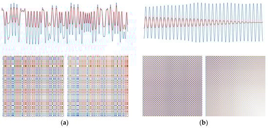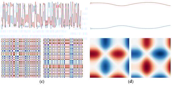 Converted four different signals to TSSG. In the waveform plot, the red line represents the I channel of the signal, and the blue line represents the Q channel. In the TSSG, the left side corresponds to the I channel, and the right side corresponds to the Q channel. (a) 32PSK; (b) QPSK; (c) OOK; (d) 64QAM.
